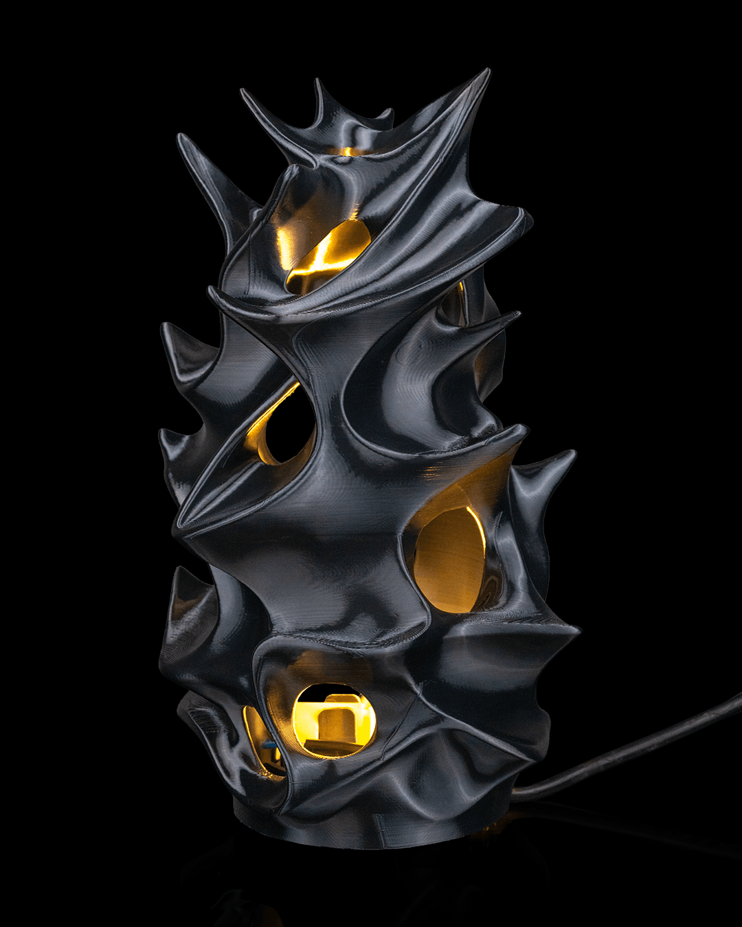 Une lampe de table sculpturale en forme de masse organique dense, comme si la lumière jaillissait de l'intérieur. Sa surface stratifiée, d'inspiration biologique, diffuse doucement la lumière, créant une lueur chaleureuse et intime.